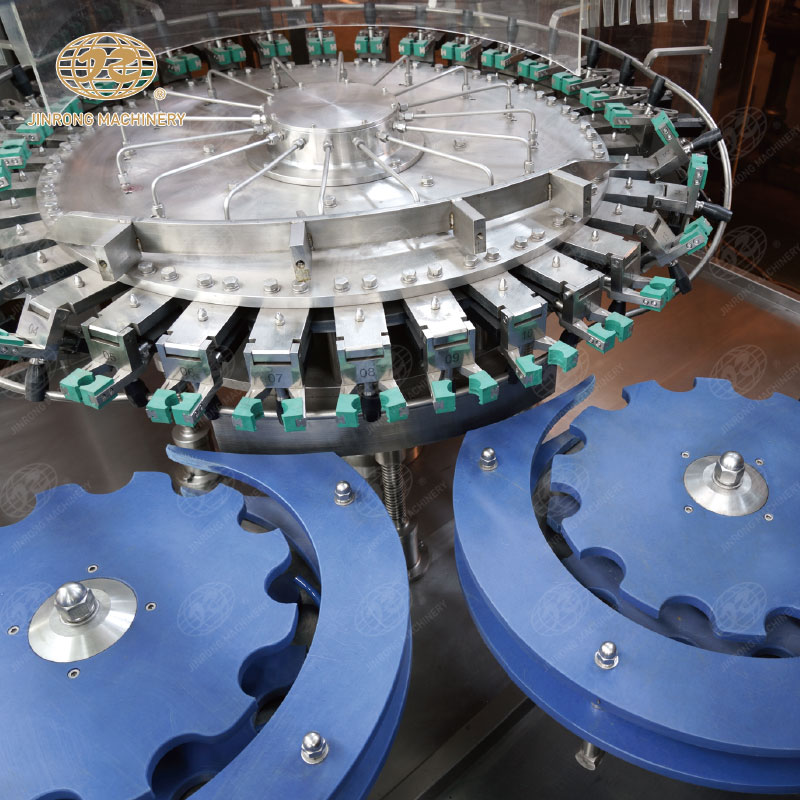 三合一含汽飲料灌裝機集清洗、灌裝、旋蓋于一體的灌裝設備,成套飲料生產(chǎn)線適合汽水、可樂、蘇打水、氣泡水等。玻璃瓶含汽飲料灌裝機組內(nèi)部一次完成洗瓶、灌裝、封蓋三道工序,瓶子磨損小、傳動準確平穩(wěn)、瓶型更換便捷。